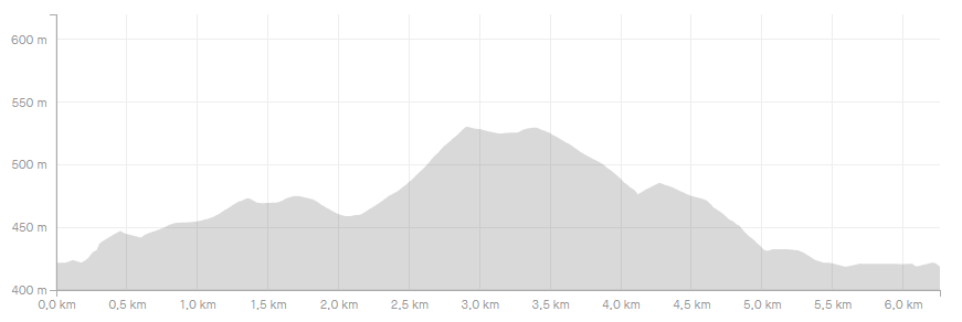 De wandeling begint in stijgende lijn, maar de laatste 3 km zijn dalend.