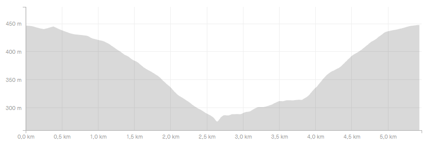 De wandeling gaat in het begin dalend en de laatste kilometers in een stijgende lijn